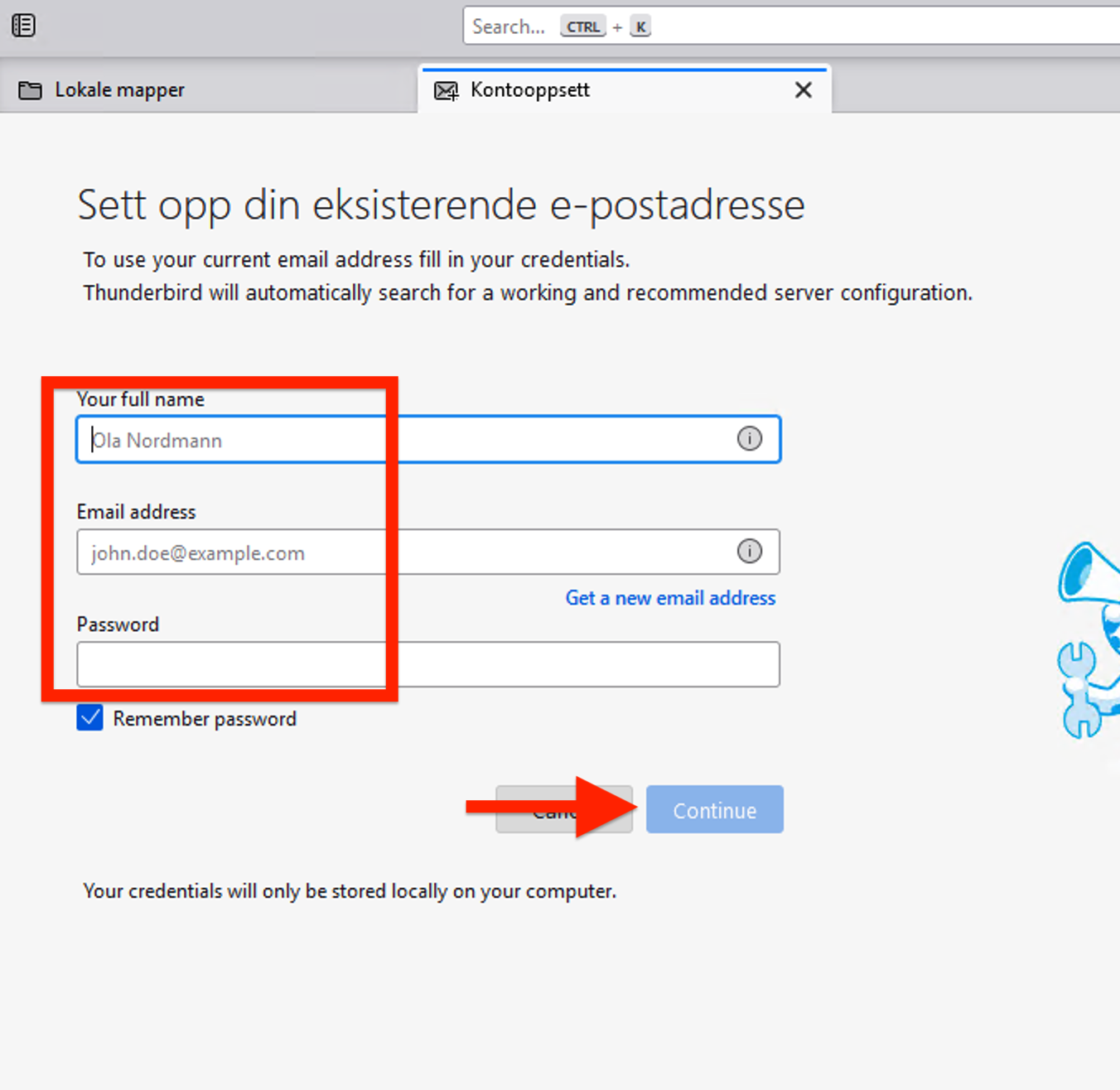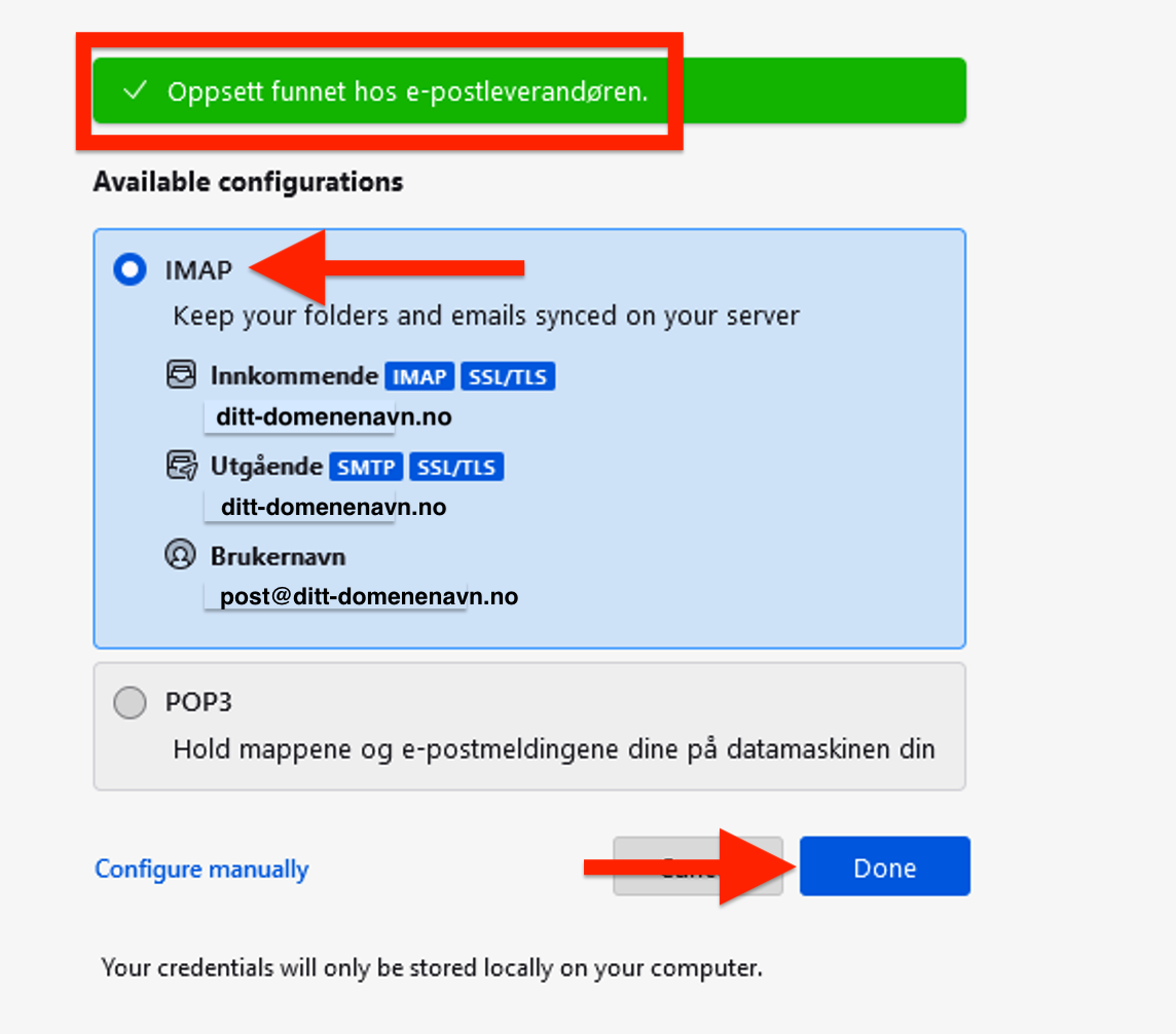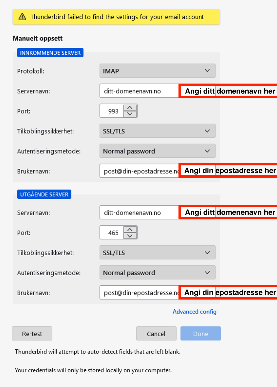 NB! Dersom Thunderbird ikke klarer å finne innstillinger, må du legge inn innstillingene for hånd (se bilde under: Manuelt Oppsett IMAP