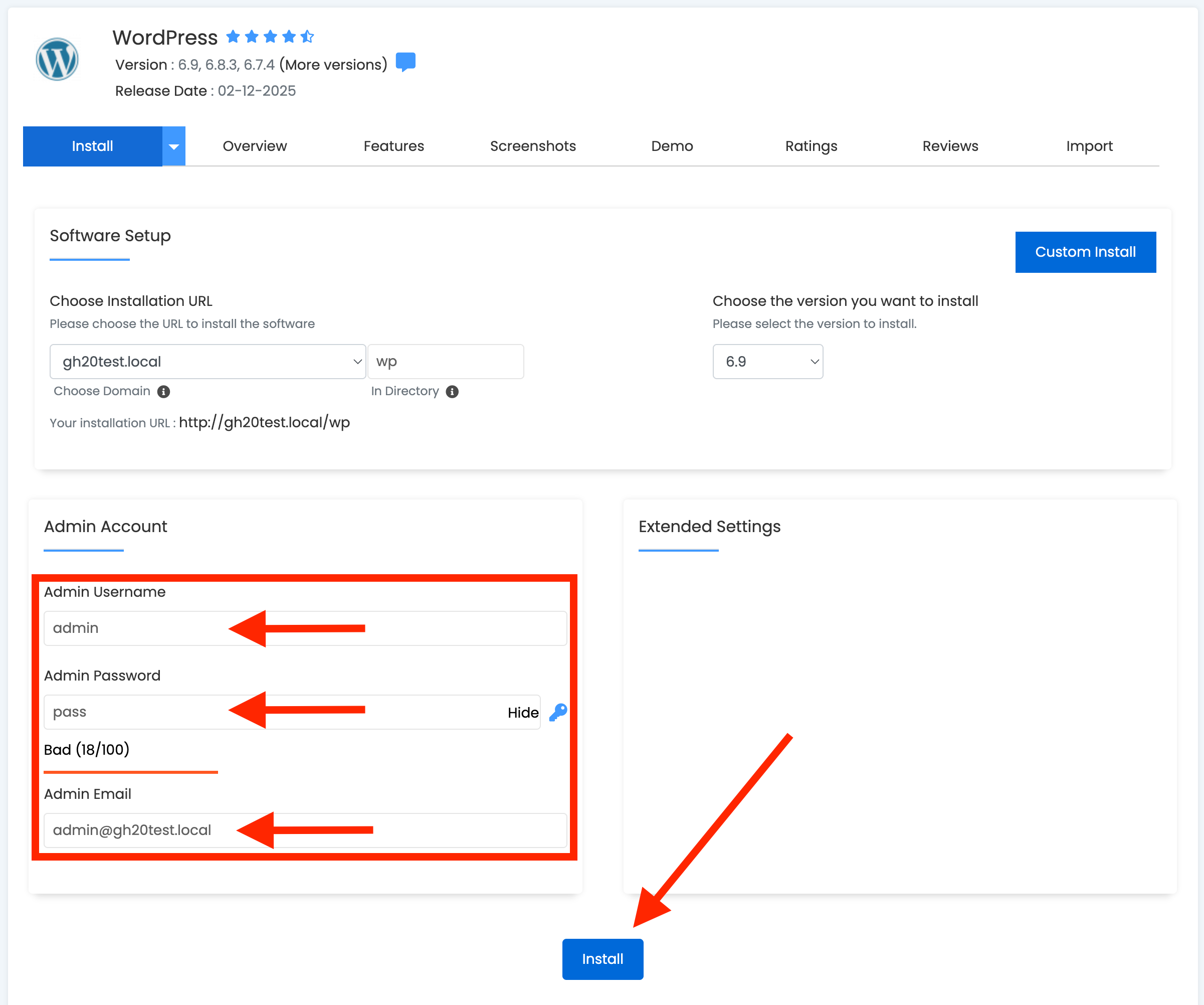 - Angi et brukernavn, passord samt epostadresse til din Wordpress nettside. Husk å notere ned ditt brukernavn og passord, dette trenger du for å logge inn i din Wordpress.