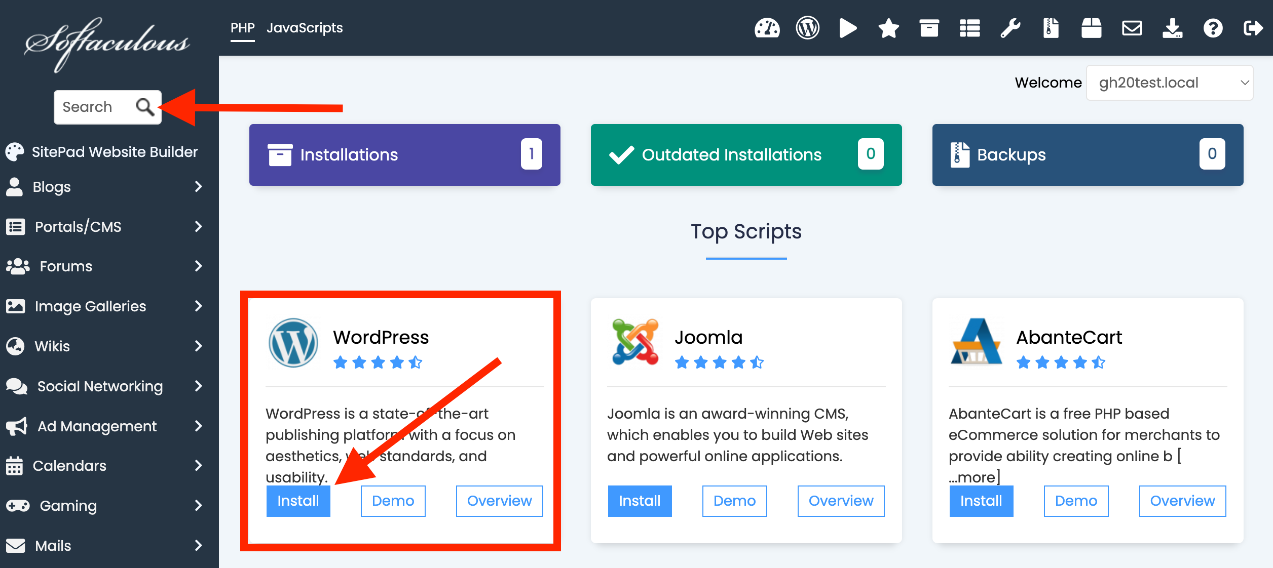 Softaculous lar deg installere apper som WordPress og andre med få klikk i kontrollpanelet.