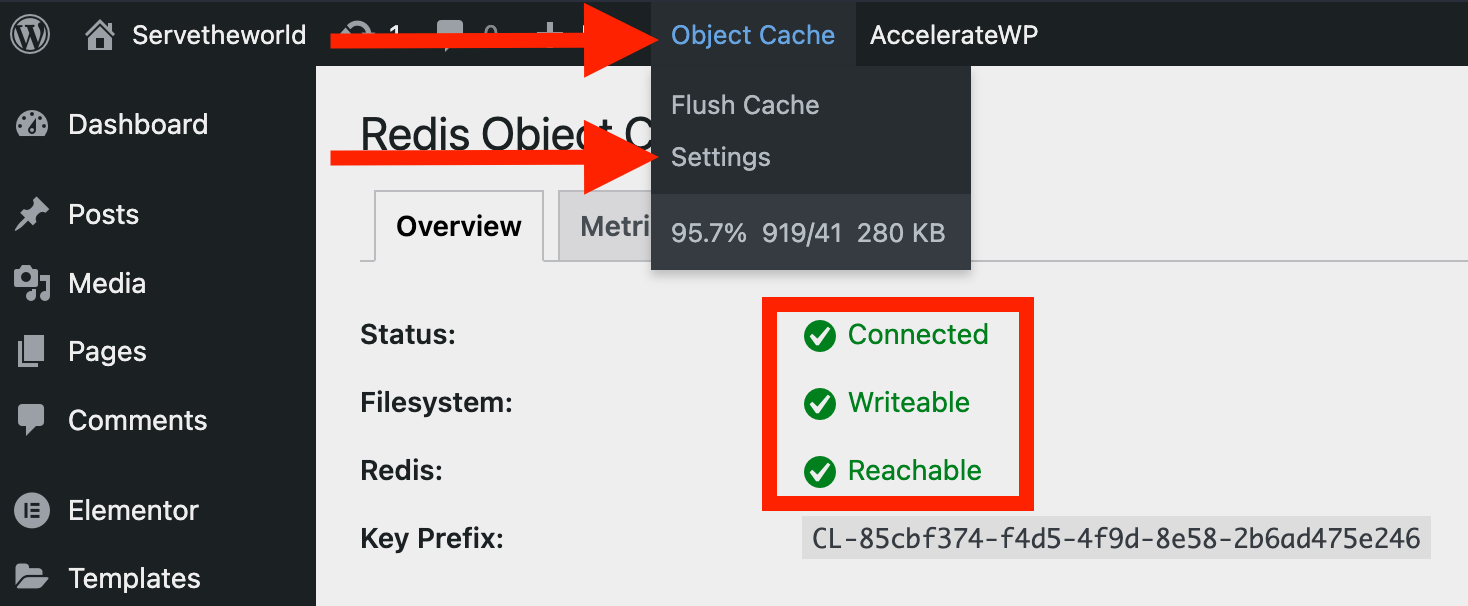 - I Wordpress Dashboard kan man når som helst se statusen på Object Cache.