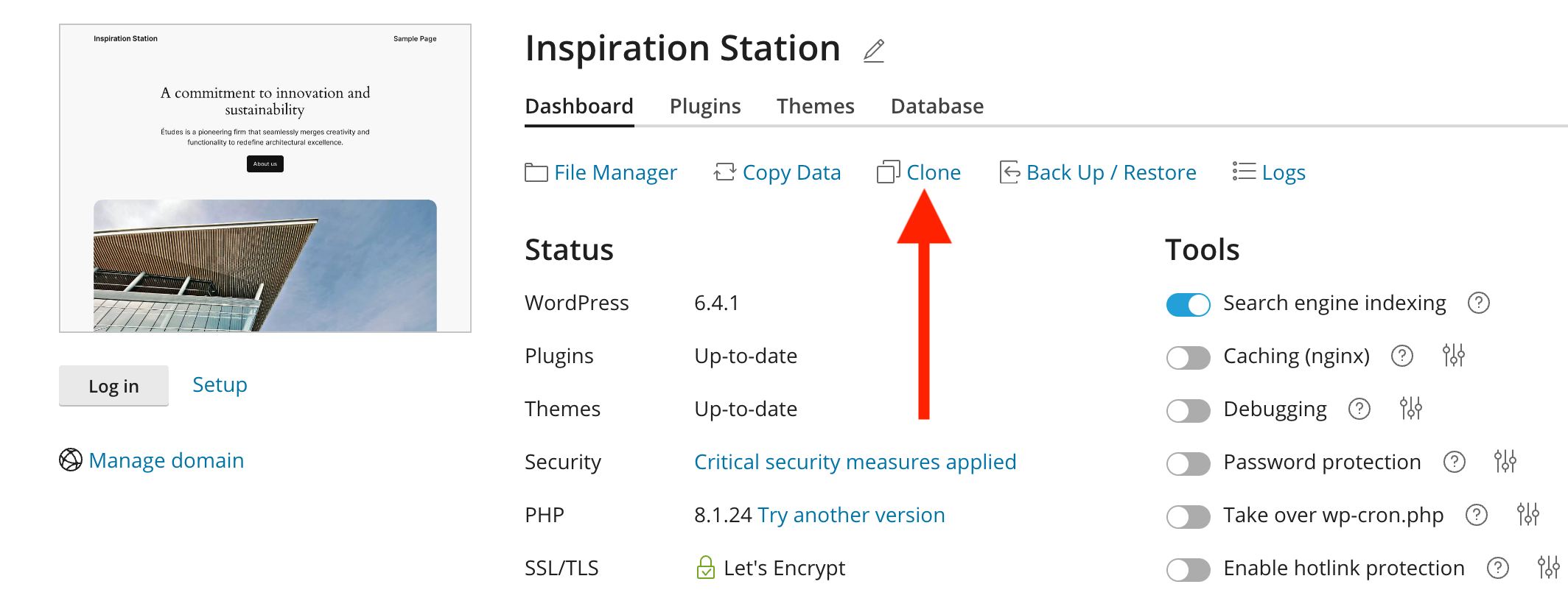 - Finn aktuelle webside i WP Toolkit og klikk på knappen Clone