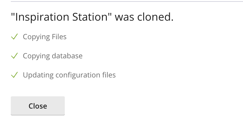 - Klikk på Close når kopieringen er utført. Du kan nå gå til webadressen for test-siden og logge inn med samme Wordpress brukernavn som på hoved siden.