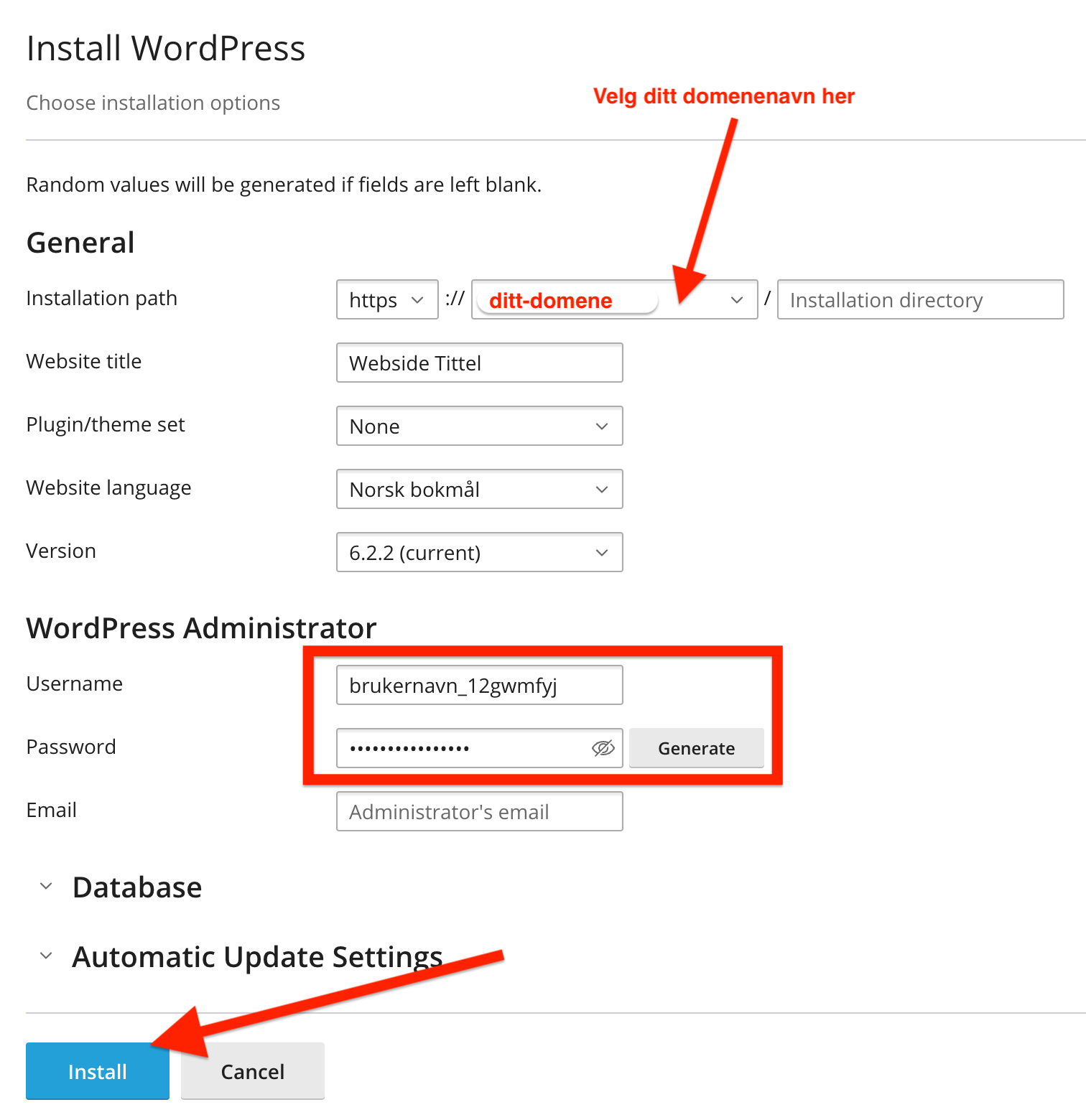 - Du kan endre feltene for brukernavn og passord - opprett et sterkt passord slik at uvedkommede ikke kan misbruke og endre innhold i din Wordpress webside.