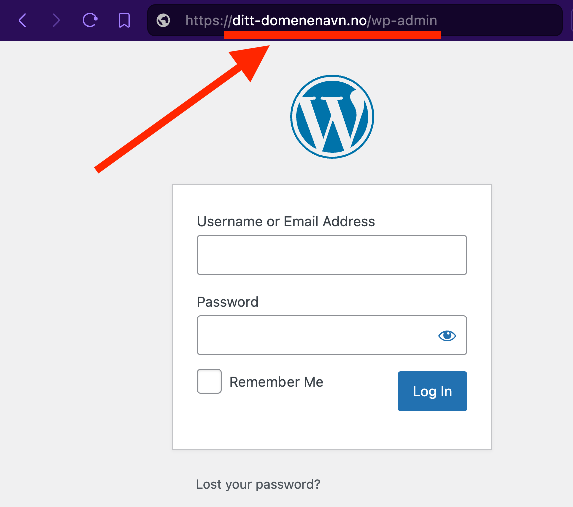 Alternativt kan du logge inn i direkte via din nettleser ved å gå til adressen din f.eks. ditt-domenenavn/wp-admin - (Bytt ut ditt-domenenavn med ditt eget domenenavn)