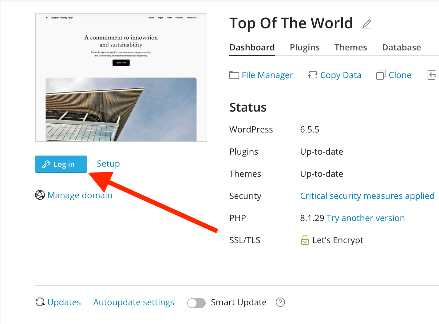 Du kan logge inn i Wordpress ved å klikke på knappen Log In (se bilde eksempel under)