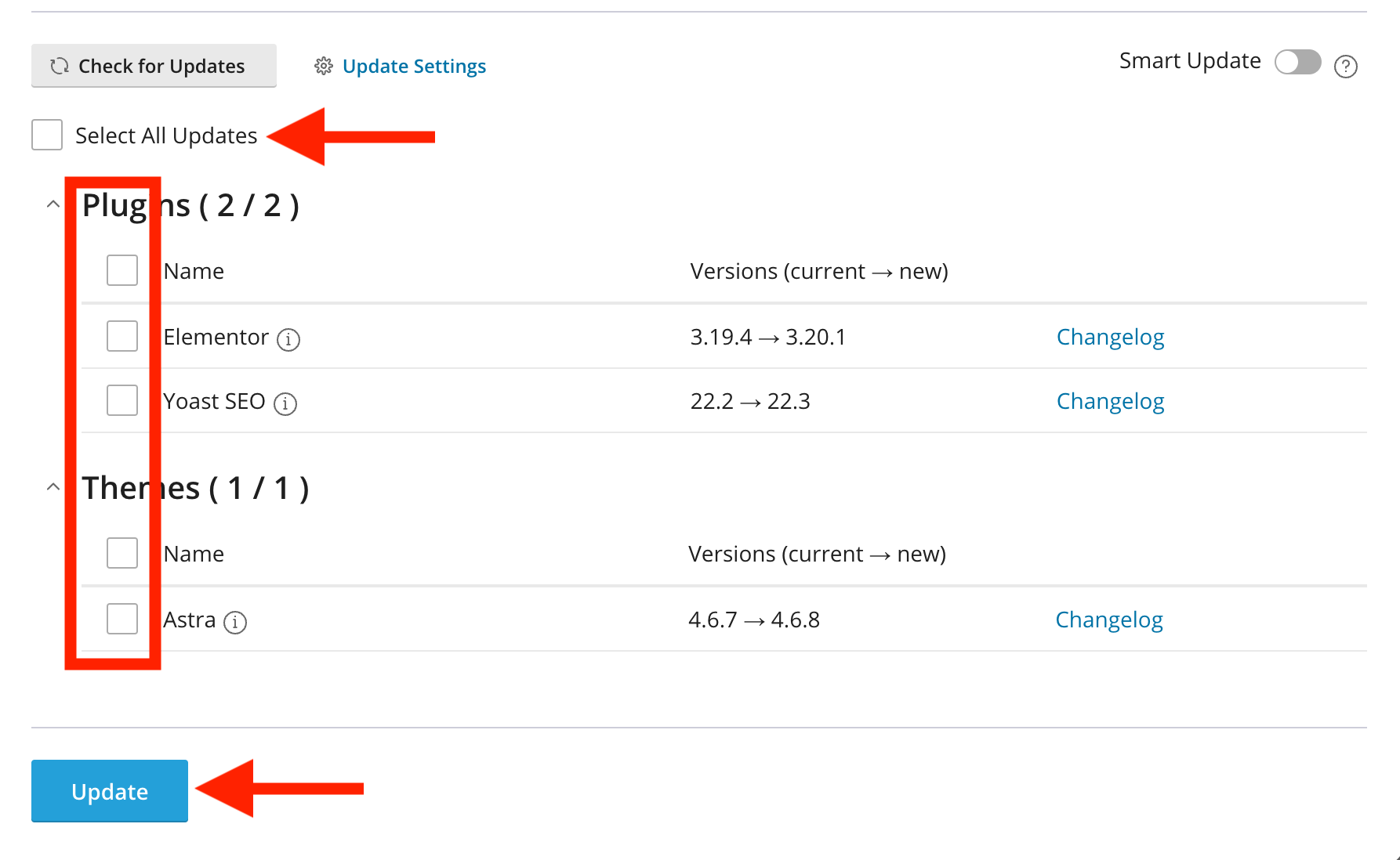 - Velg deretter aktuelle plugins eller tema du ønsker å oppdatere